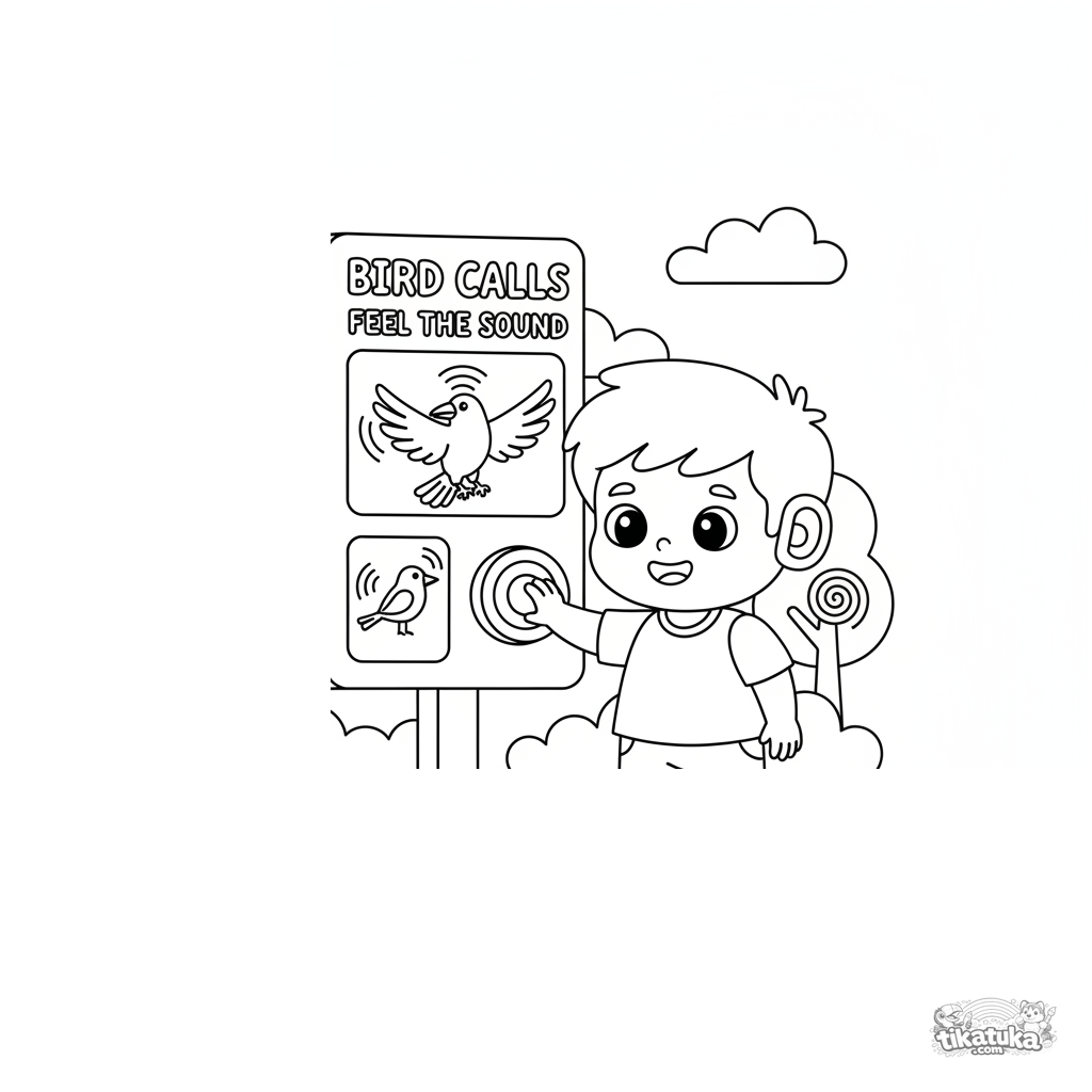 Ausmalbild für Kinder 4-6: Ein Kind mit Hörgerät lernt Vogelrufe von einem taktilen Schild mit Schallwellenmustern im Zoo.