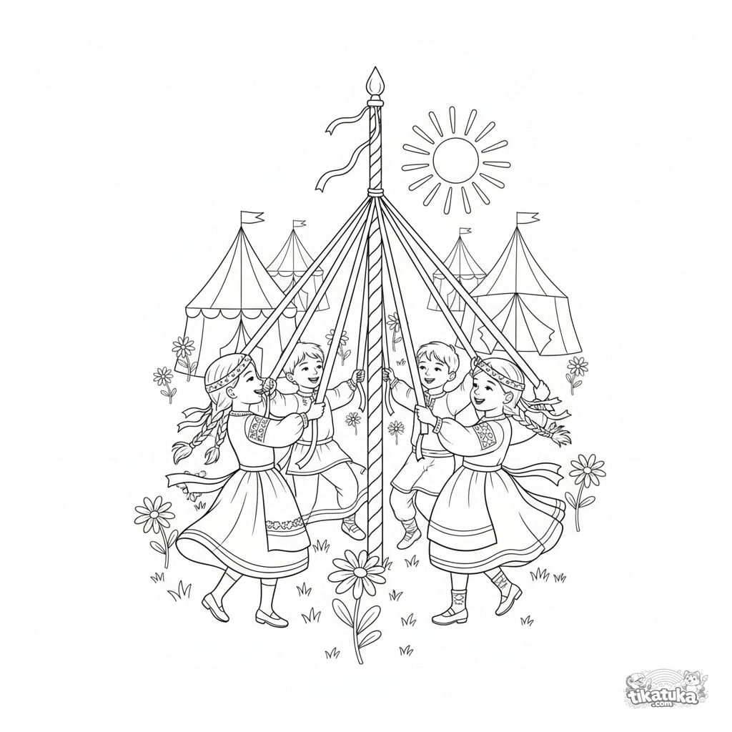 Ausmalbild für Kinder 4-6: Fröhliche Kinder in Volkstracht tanzen mit Bändern um einen Maibaum. Eine helle Folklore-Szene.