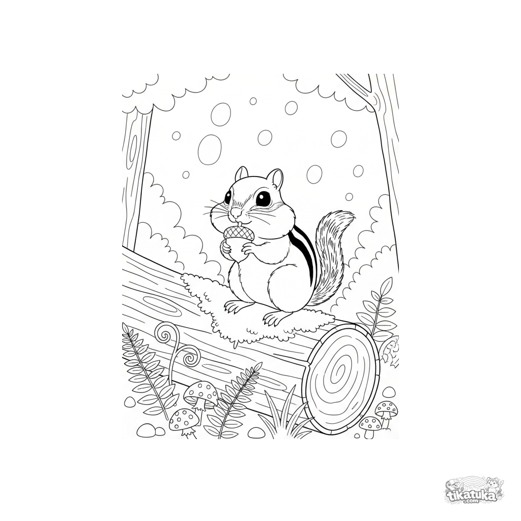 Ausmalbild eines Streifenhörnchens mit einer Eichel auf einem moosigen Baumstamm im Wald. Für Kinder von 4-6 Jahren. Detaillierte Naturszene.