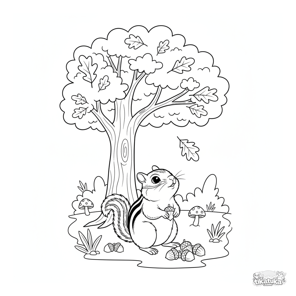Ausmalbild eines Streifenhörnchens im Herbstwald. Für Kinder von 4-6 Jahren. Das Hörnchen mit vollen Backen schaut neugierig auf ein fallendes Blatt.