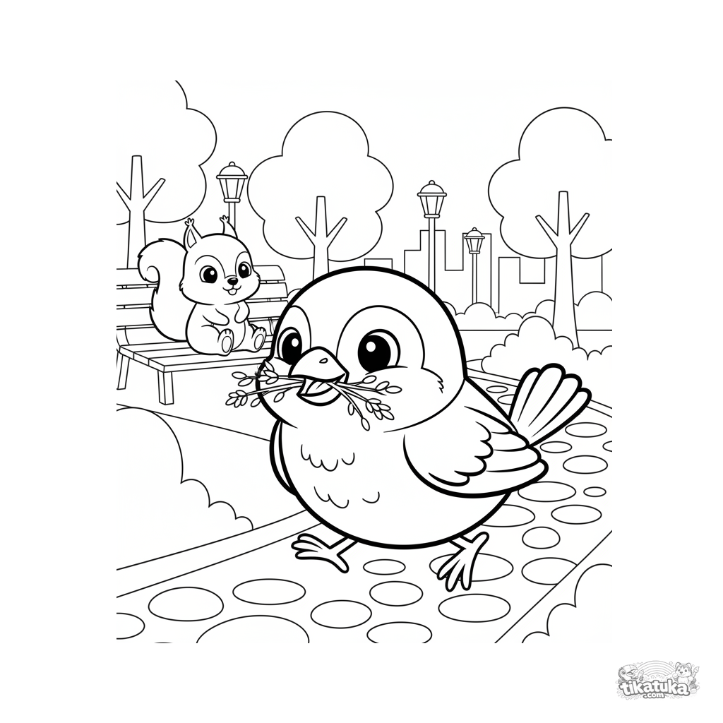 Ausmalbild für Kinder: Ein Spatz sammelt Zweige für sein Nest im Stadtpark. Geeignet für Kinder von 4 bis 6 Jahren.