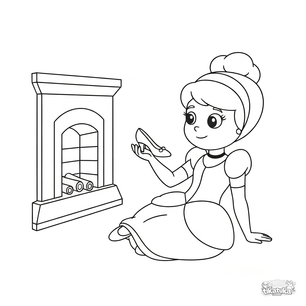 Ausmalbild für Kinder. Aschenputtel sitzt am Kamin und hält ihren Glasschuh. Einfache Konturen für Kleinkinder. Kostenlos herunterladen.