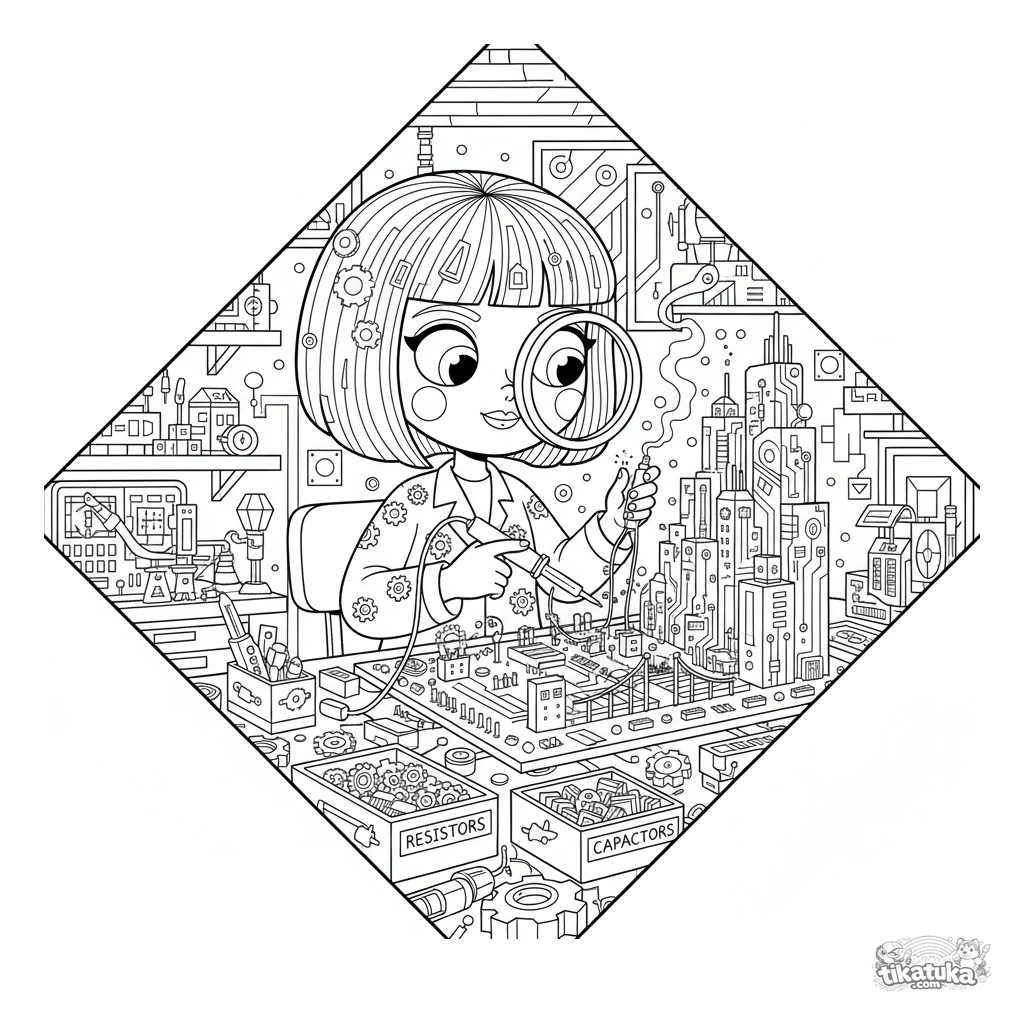 Konstruktivistisches Ausmalbild: Ein Künstler erschafft ein Leiterplatten-Kunstwerk in einem Hacker-Keller. Geometrische Formen, viele Details elektronischer Bauteile für 10-12 Jahre.