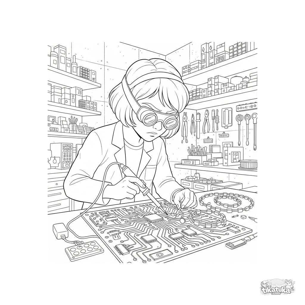 Ausmalbild für Kinder von 10-12: ein Teenager-Künstler erschafft ein LED-Kunstwerk auf einer Leiterplatte, indem er sorgfältig Komponenten in einem gut ausgestatteten Hacker-Keller verlötet.