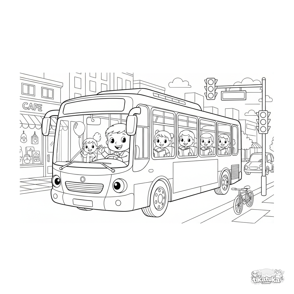 Ausmalbild für Jungen: ein moderner Stadtbus fährt eine belebte Straße entlang. Für Kinder im Alter von 4-6 Jahren.