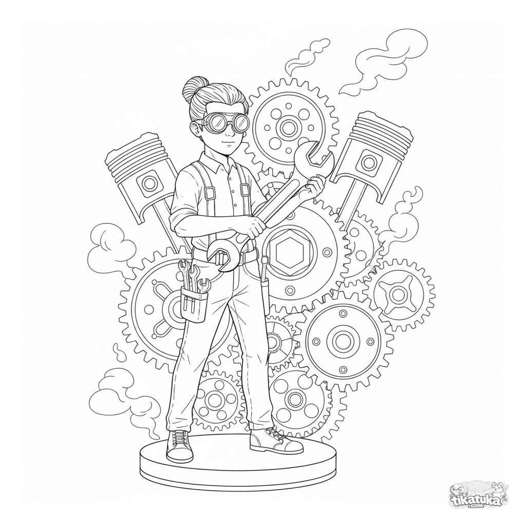 Komplexes Ausmalbild im Gravierstil für Kinder 10-12: ein Ingenieur stimmt ein riesiges Zahnradgetriebe in einem dampfbetriebenen Labor ab.