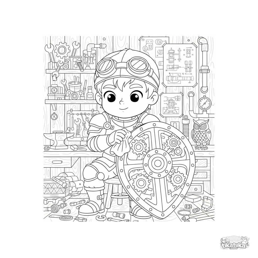 Detailliertes Ausmalbild eines Steampunk-Uhrwerk-Ritters, der sein Zahnrad-Schild poliert. Für ältere Kinder von 7-12 Jahren, mit mechanischen Mustern.