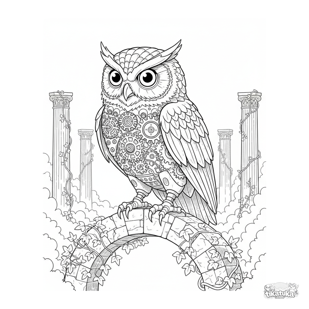 Komplexes Ausmalbild für 10-12 Jahre: Ein detaillierter Uhrwerk-Eulenwächter auf einem Steinbogen in einer überwucherten alten Stadt. Vintage-Gravurstil mit Zahnrädern und Efeu.