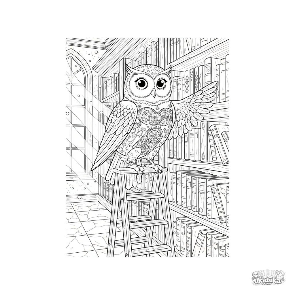 Ausmalbild für 10-12 Jahre: Eine detaillierte Uhrwerk-Eule aus Zahnrädern sitzt auf einer Leiter in einer magischen Bibliothek. Komplexe Fantasieszene im Stich-Stil.