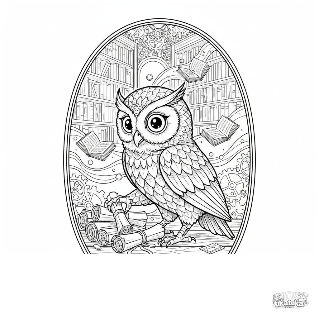 Detailliertes Ausmalbild eines Uhrwerk-Eulen-Bibliothekars, der Schriftrollen in einem Turm aus Zahnrädern und Büchern sortiert. Für Kinder von 10-12 Jahren.