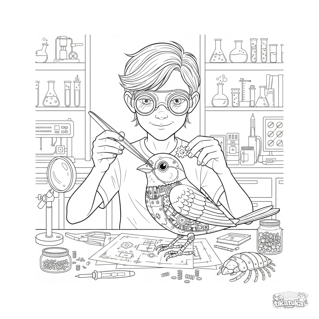 Ausmalbild für Kinder 10-12: Ein junger Uhrwerk-Tüftler in einem geheimen Labor baut einen komplexen mechanischen Vogelautomaten zusammen. Detaillierte Szene mit Zahnrädern und Werkzeugen.