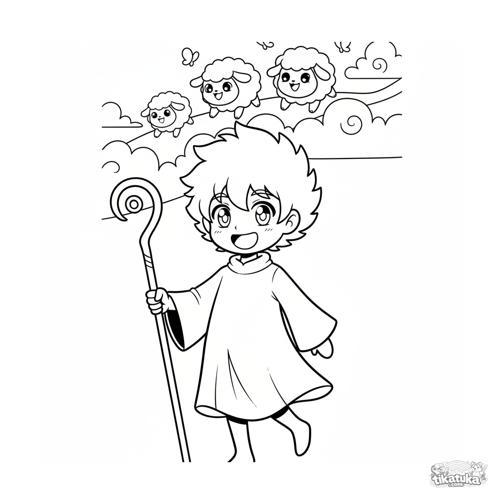Ausmalbild für Tweens 7-9: ein fröhlicher Wolkenhirte geht über einen Himmelspfad und hütet eine Herde flauschiger Schafwolken.