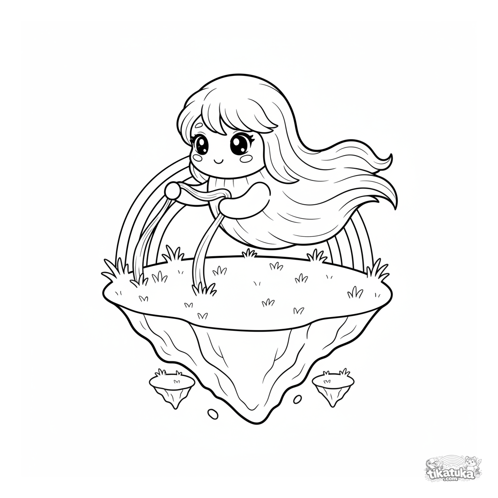 Ausmalbild für 7-9 Jahre: Ein zarter Wolkengeist webt einen kleinen Regenbogen aus Nebel über einer schwebenden Insel. Anmutige, magische Szene mit fließenden Linien.