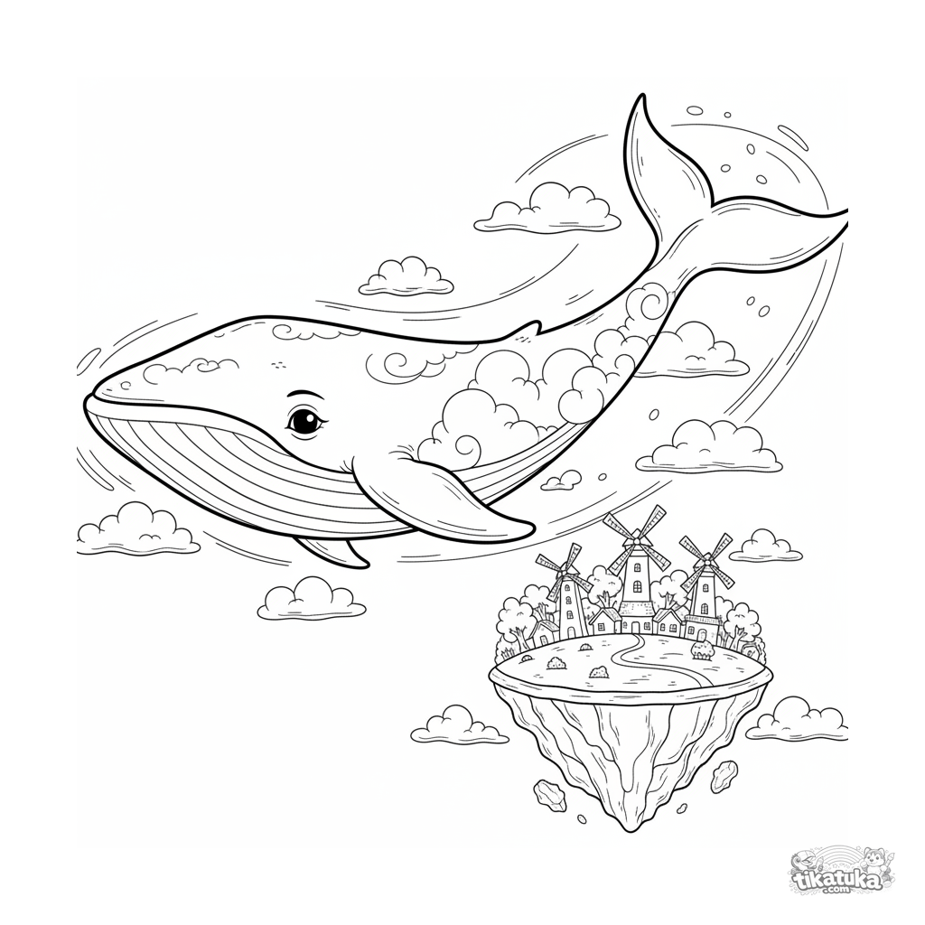 Detailliertes Ausmalbild für Kinder 10-12: Ein majestätischer Wolkenwal schwimmt über einem Dorf auf einer schwebenden Insel. Komplexe Fantasieszene.