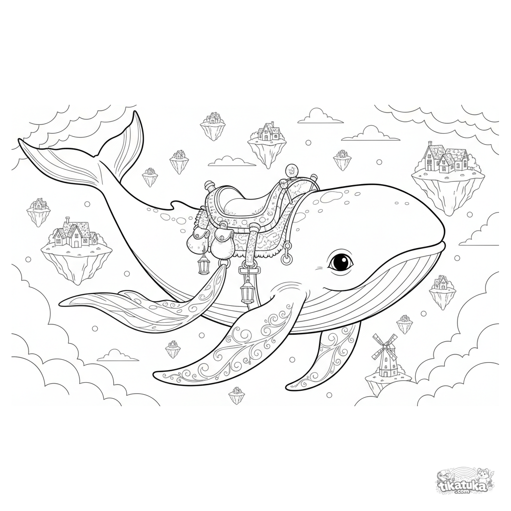 Ausmalbild für 10-12 Jahre: Ein majestätischer Wolkenwal schwimmt über schwebenden Inseln. Detaillierte Fantasieszene für erfahrene Maler.