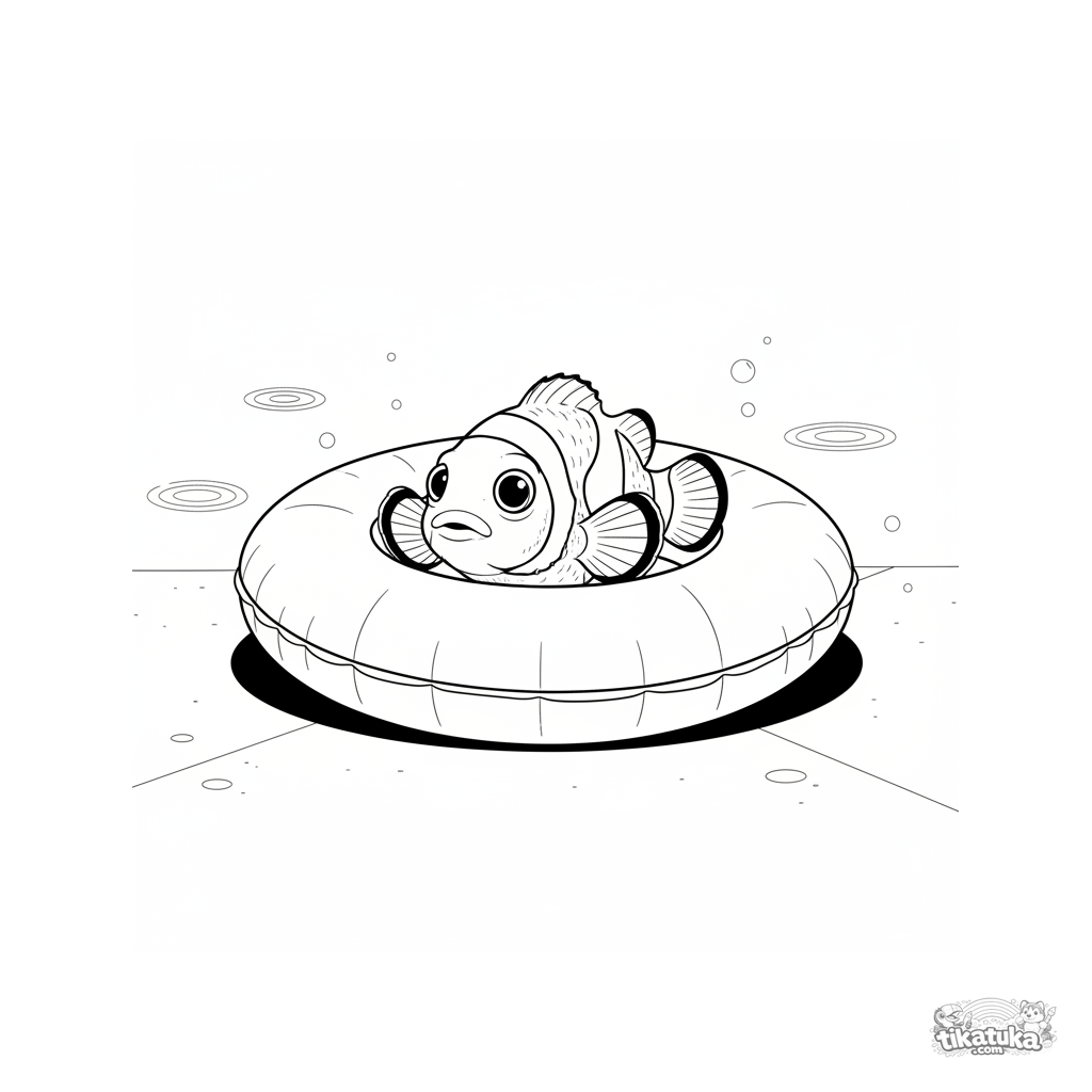 Detailliertes, realistisches Ausmalbild für ältere Kinder 10-12: Ein Clownfisch lugt aus dem Schatten eines Schwimmrings am Beckenboden hervor. Anatomisch genaue Umrisse.