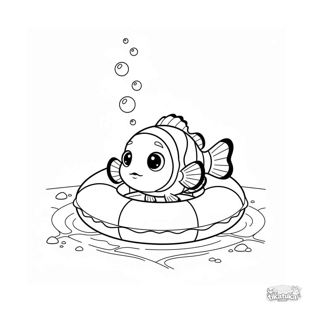 Ausmalbild für Kinder 7-9: ein gestreifter Clownfisch lugt schüchtern aus einem Schwimmring. Weiche runde Formen, niedliche Szene.