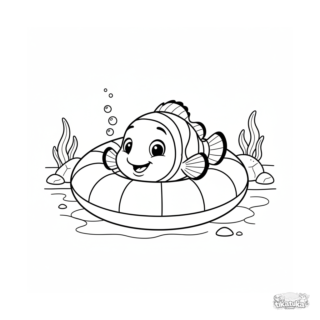 Ausmalbild für Tweens 7-9: Ein verspielter Clownfisch lugt aus dem Tunnel eines Schwimmrings am Poolboden. Ausdrucksstarkes Gesicht, rahmenartige Komposition.