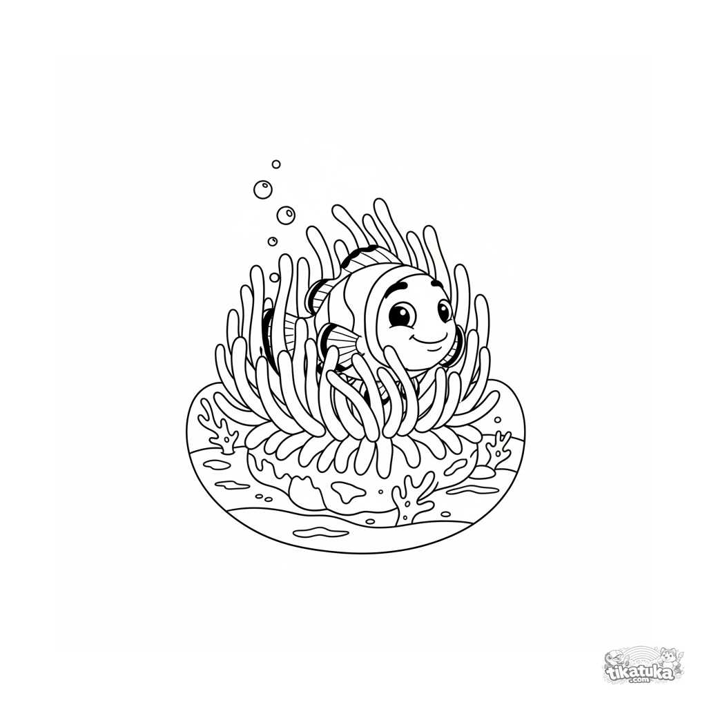 Lustiges Ausmalbild im 90er-Jahre-Stil: Clownfisch lugt aus einer Seeanemone an einem sonnigen Korallenriff. Für Kinder von 4-6 Jahren.