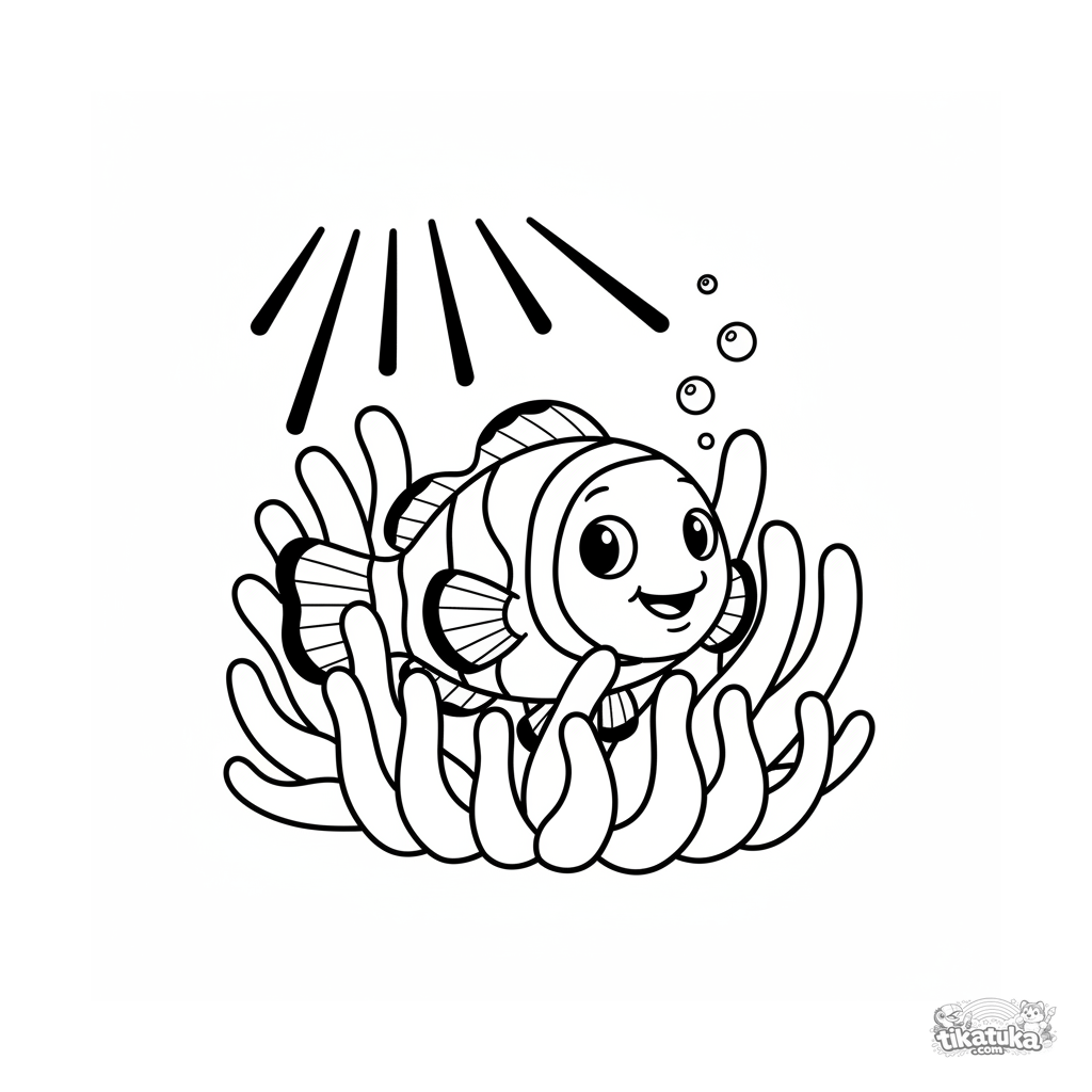 Lustiges Ausmalbild eines Clownfisches, der aus einer Seeanemone im sonnigen Flachwasser lugt. Für Kinder von 4-6 Jahren.