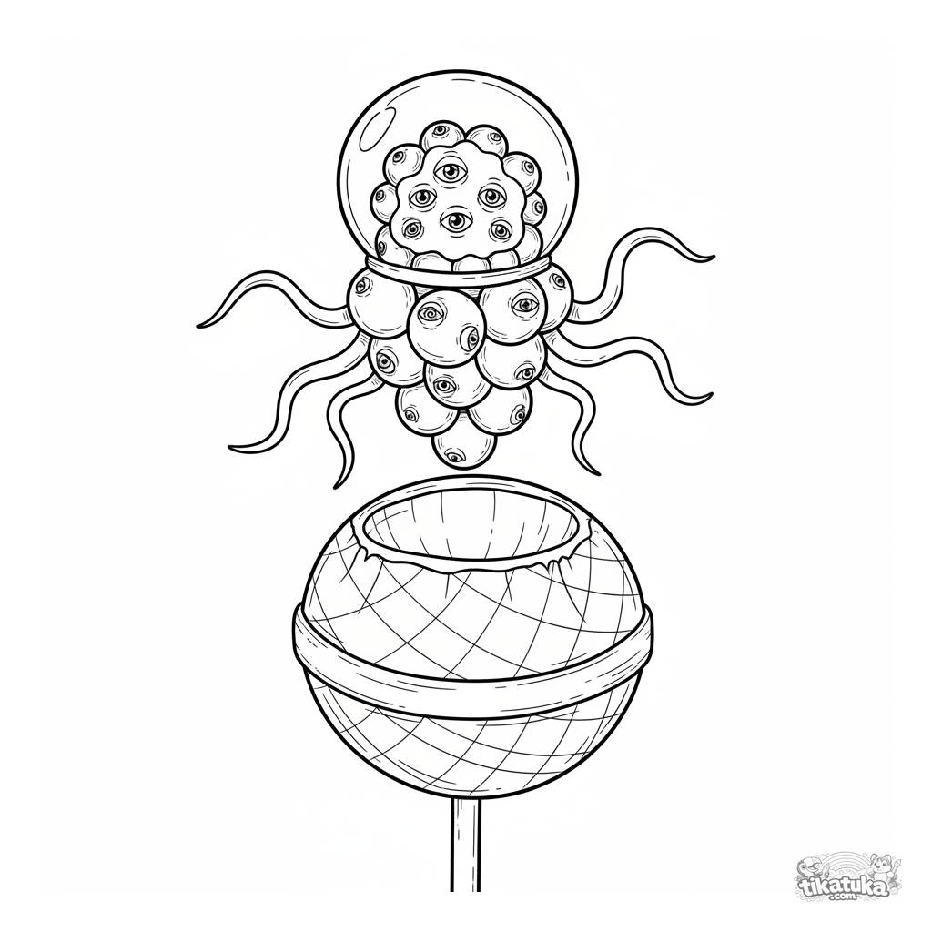 Detailliertes Ausmalbild für ältere Kinder 10-12: Eine traubenförmige Mikrobe in einem Raumanzug erkundet die Krater eines Lollis wie einen Süßigkeitenplaneten.