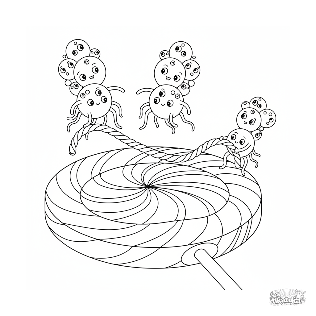Detailliertes Ausmalbild für ältere Kinder 10-12: Traubenförmige Mikroben spielen fröhlich Seilspringen auf der Oberfläche eines riesigen Lollipops.