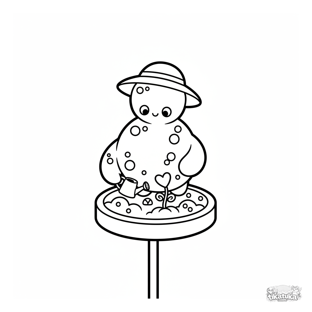 Einfaches Ausmalbild für Kleinkinder 2-3: Eine traubenförmige Mikrobe mit Sonnenhut gießt eine kleine Blume auf einem Lutscher. Große, klare Formen.