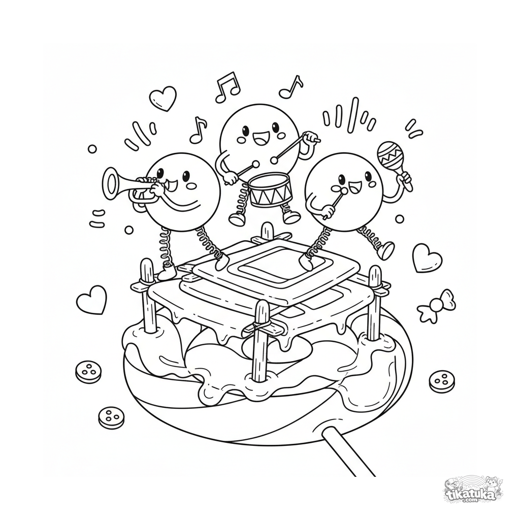 Ausmalbild für Kinder 4-6: Ein fröhlicher Mikroben-Cluster spielt Instrumente auf einer Lollipop-Bühne. Lustige Retro-Formen, mehrere Charaktere.