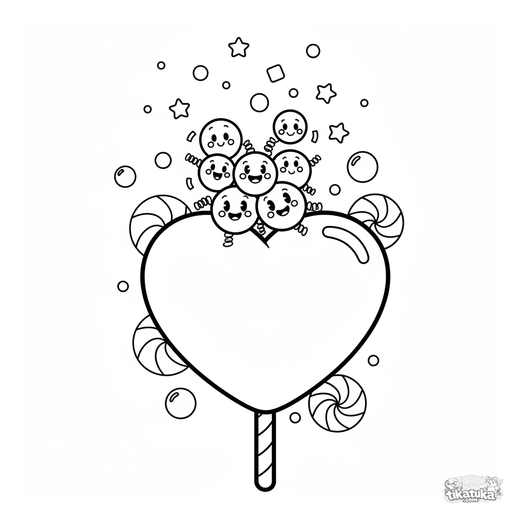 Lustiges Ausmalbild für Kinder 4-6: Ein Traubenmikrobe im alten Cartoon-Stil feiert auf einem herzförmigen Lollipop. Konfetti und einfache, fröhliche Gesichter.