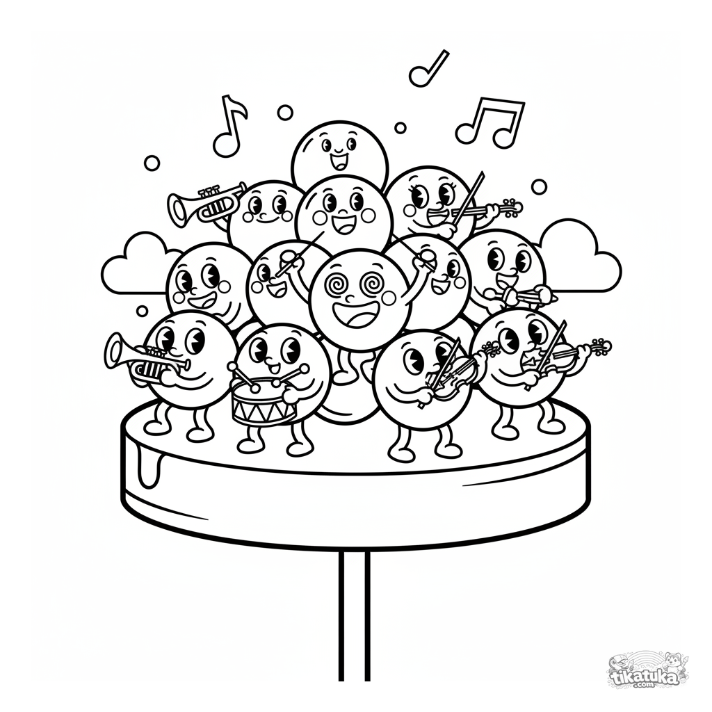 Lustiges Ausmalbild für Kinder von 4-6 Jahren: Ein Traubenmikrobe dirigiert ein Orchester auf einem Lollipop. Ein helles Cartoon-Bild im Retro-Stil der 1930er Jahre.