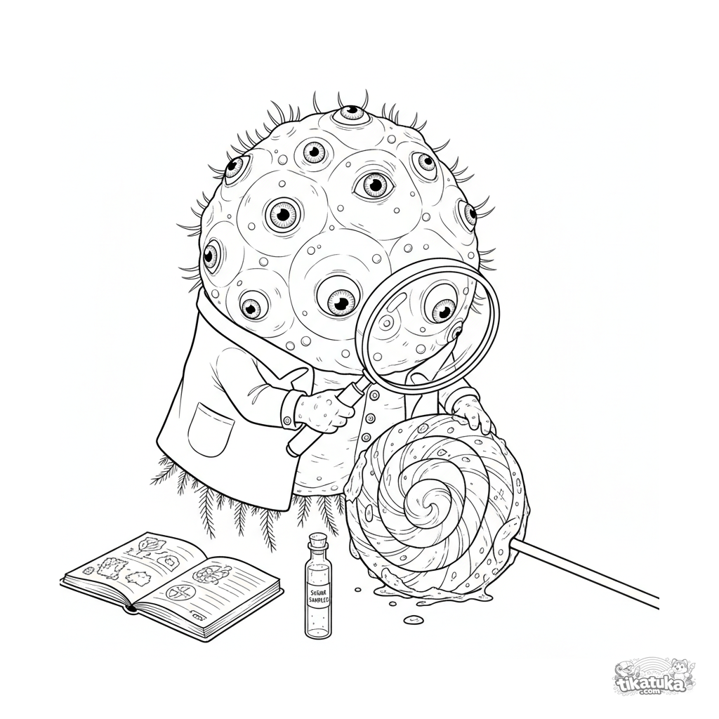 Detailliertes realistisches Ausmalbild für ältere Kinder 10-12: Eine traubenförmige Mikrobe untersucht Lollipop-Kristalle. Wissenschaftliche Details, präzise Umrisse.