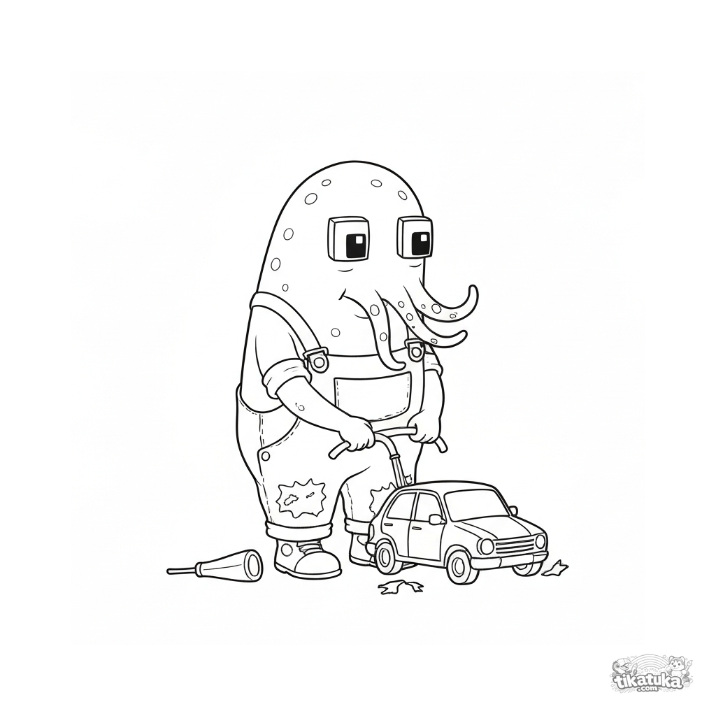 Ausmalbild für Kinder 8-12 Jahre. Lustiger Mikroben-Mechaniker mit Tentakeln und Pixel-Augen repariert kleines Auto. Kostenlos herunterladen.
