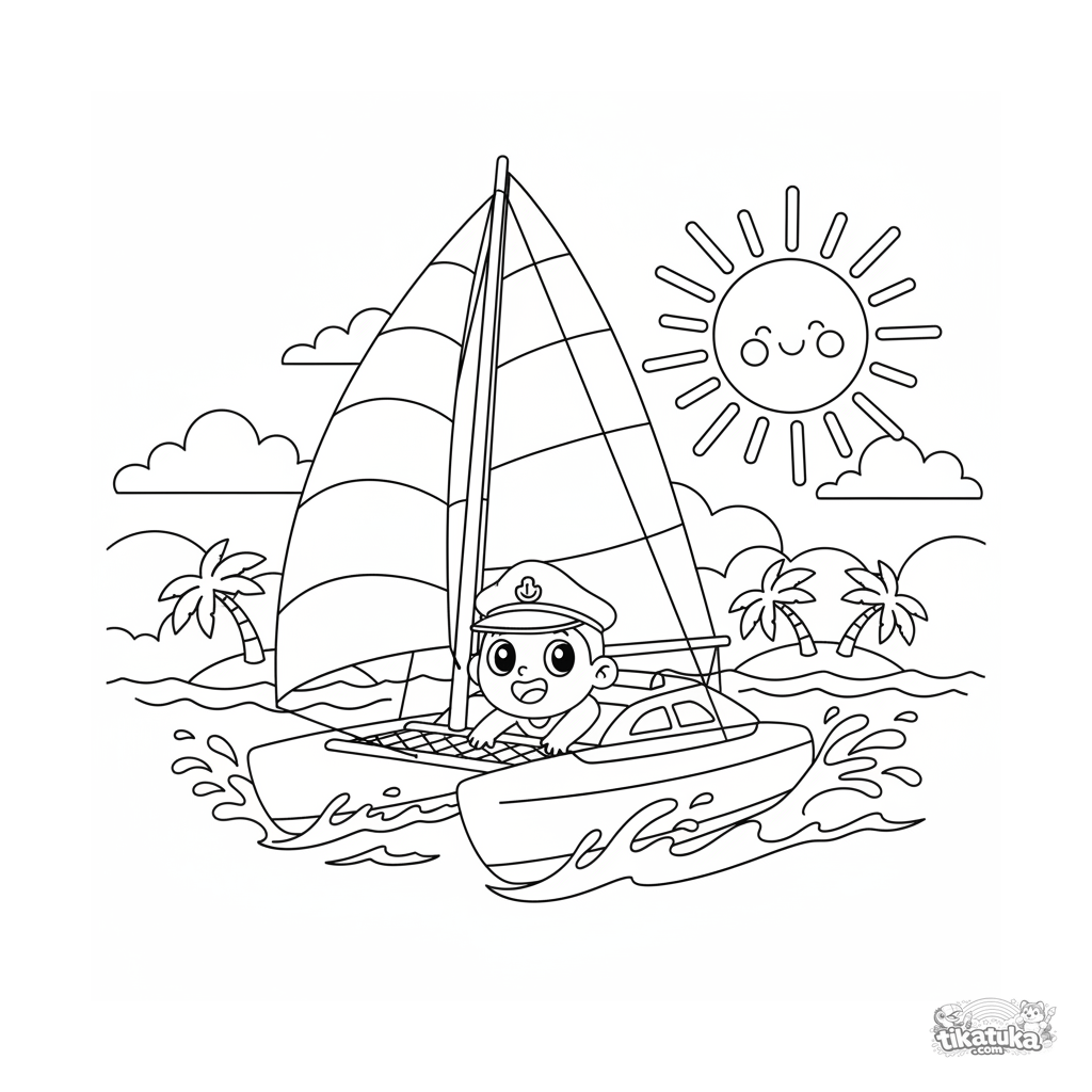 Ausmalbild für Tweens 7-9: ein schneller Katamaran mit gestreiften Segeln rennt in einer tropischen Bucht. Ein Segler lehnt sich heraus, Palmeninseln im Hintergrund.