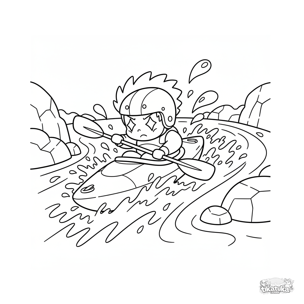 Ausmalbild für Kinder 4-6: Ein farbenfrohes Kajak mit einem behelmten Paddler rast Stromschnellen hinunter, mit spritzendem Wasser und felsigen Ufern in einer dynamischen Szene.