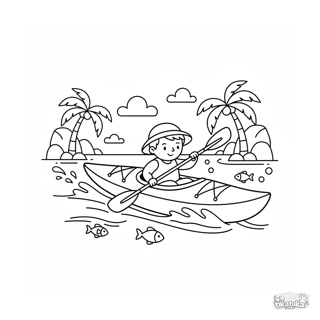 Ausmalbild für Kinder 4-6: Ein schnelles Kajak rennt über eine tropische Bucht. Helle, saubere Formen und eine dynamische Pose.