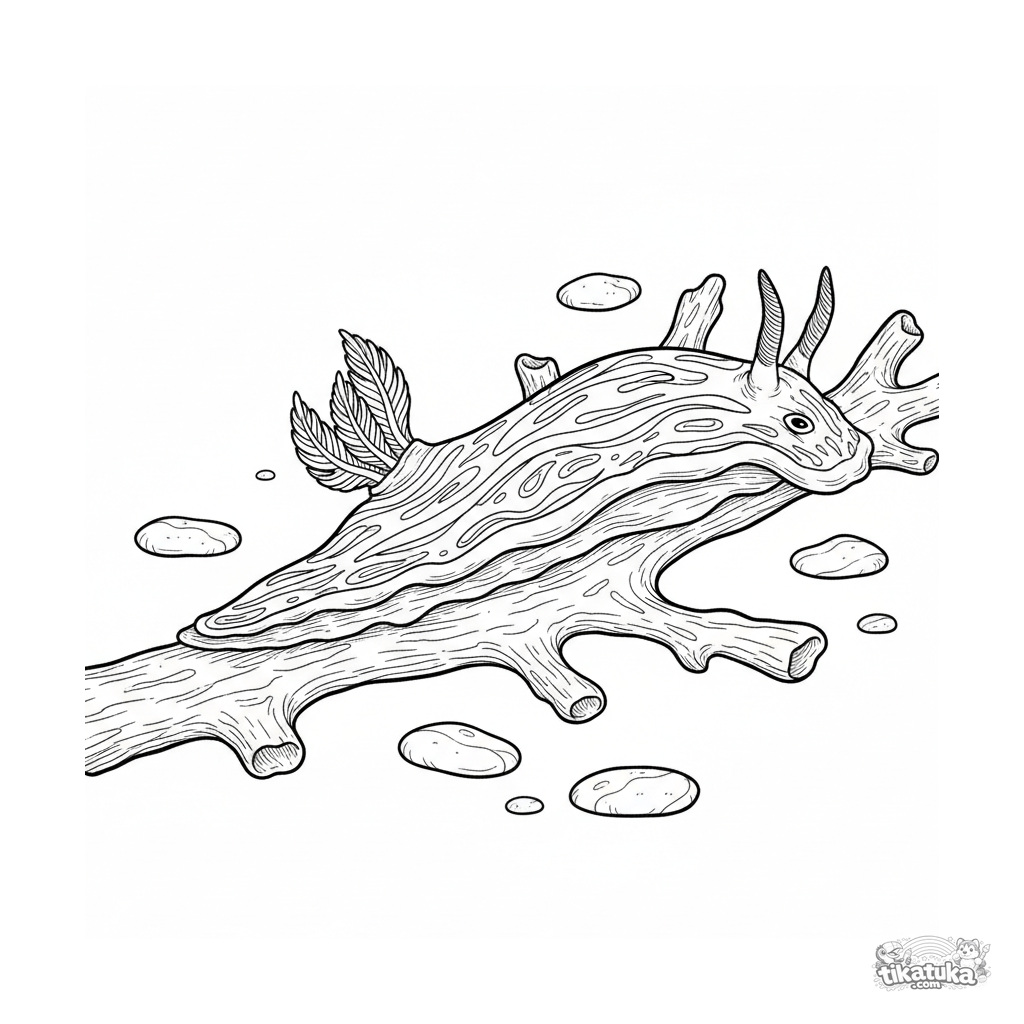 Detailliertes Ausmalbild für 10-12 Jahre: Eine bunte Nacktschnecke kriecht auf Koralle im sonnenbeschienenen Flachwasser. Stil einer Vintage-Gravur.