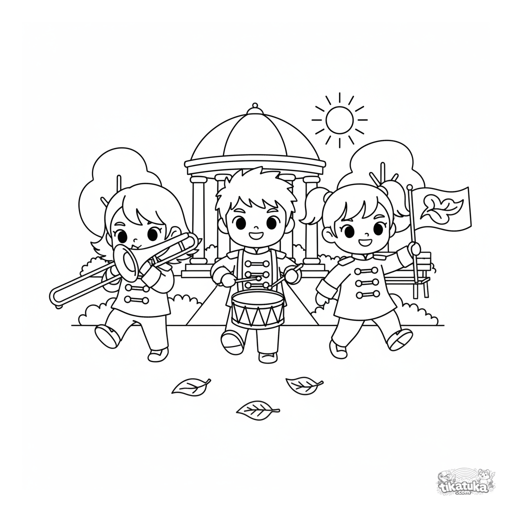 Ausmalbild für Kinder 6-9: Eine Kinder-Blaskapelle übt in der Nähe eines Gartenhauses im Park. Eine lustige, dynamische Szene im Comic-Abenteuer-Stil.