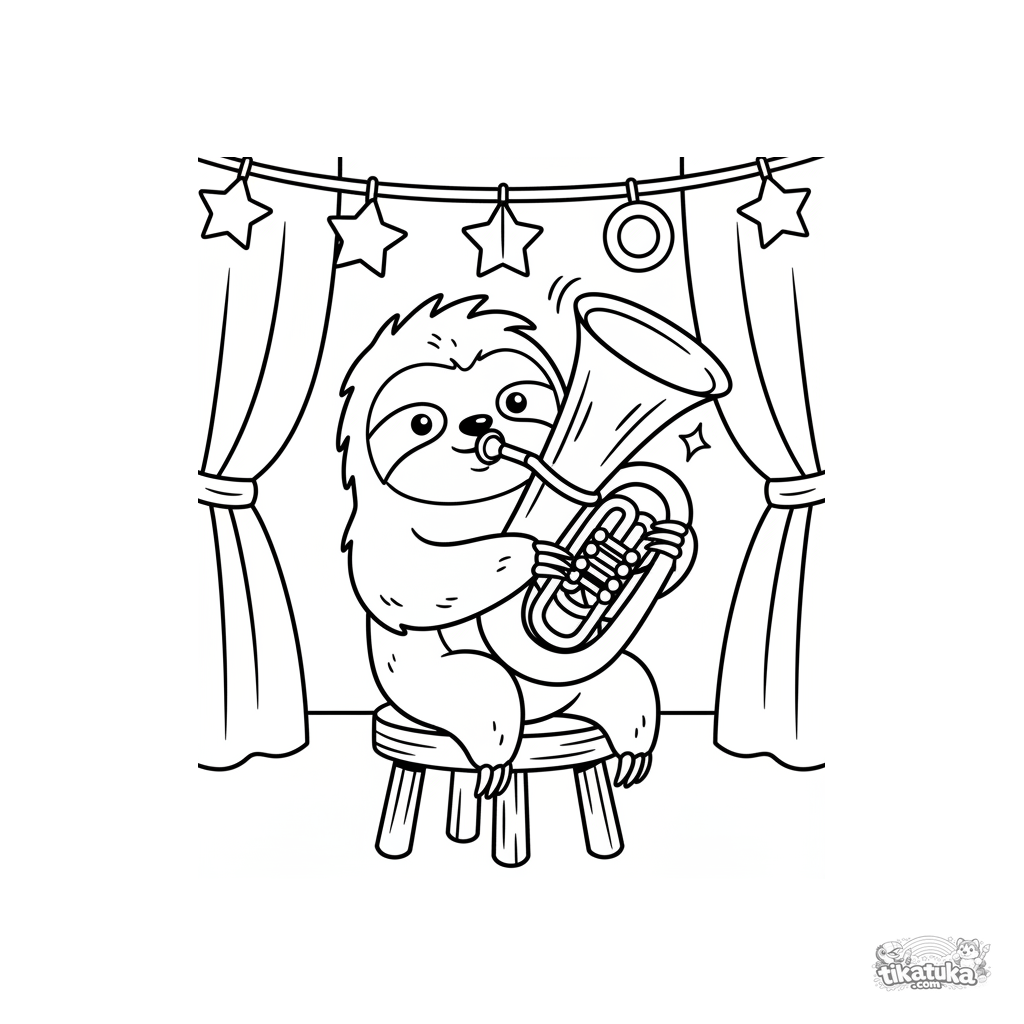 Kinder-Ausmalbild: ein Faultier spielt Tuba auf einer Schulbühne. Lustige und ernste Szene mit Dekorationen.