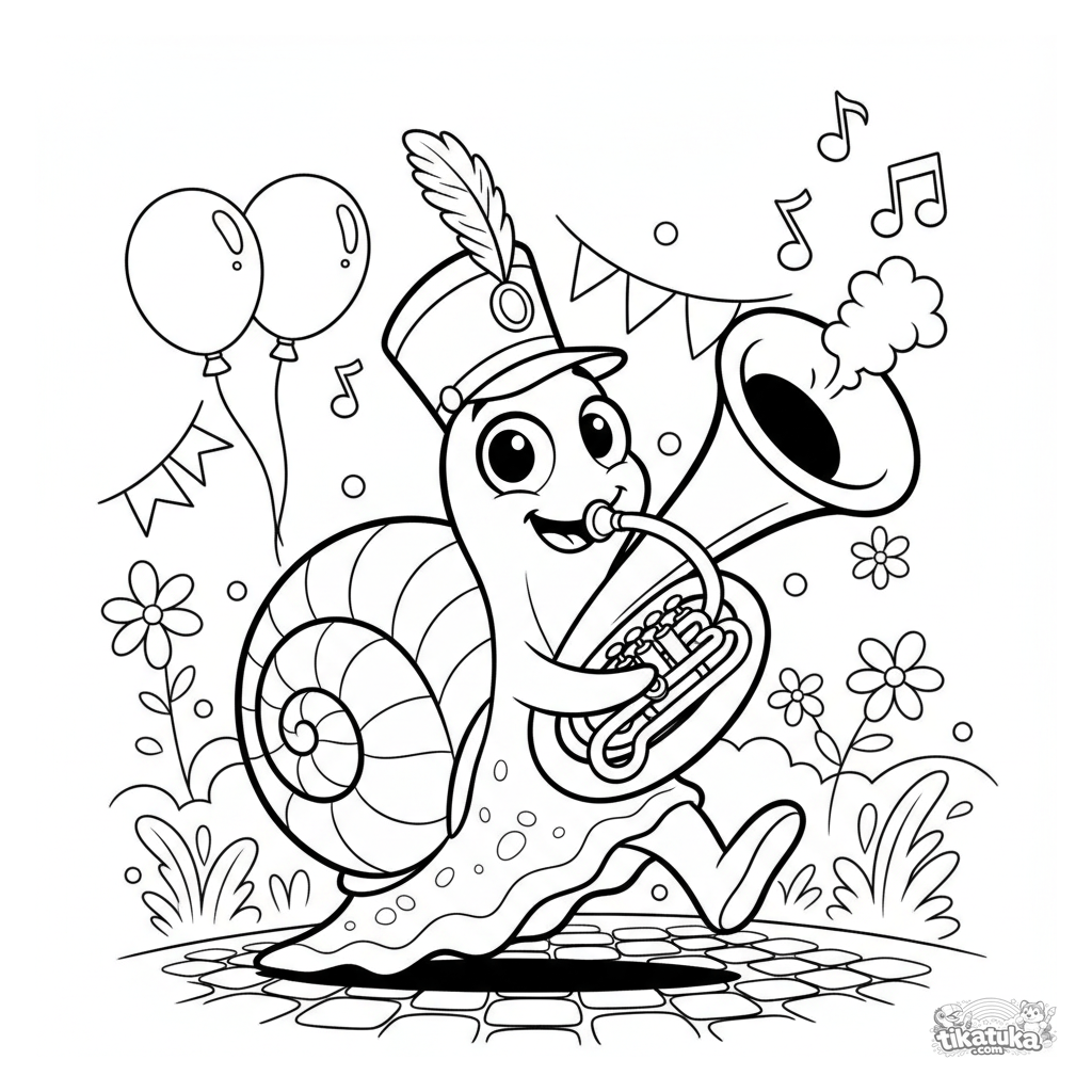 Lustiges Comic-Stil Ausmalbild: eine Schnecke mit einer Tuba in einer Marschkapelle. Dynamische Parade-Szene, perfekt für Kinder.