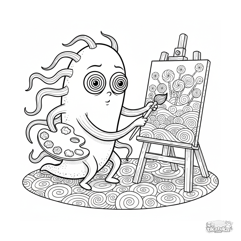 Detailliertes Ausmalbild für ältere Kinder 10-12: Eine kommaförmige Mikrobe mit Hypno-Augen malt eine Landschaft der Lollipop-Welt. Eine Szene im Aquarell-Skizzen-Stil mit Staffelei und Farben.