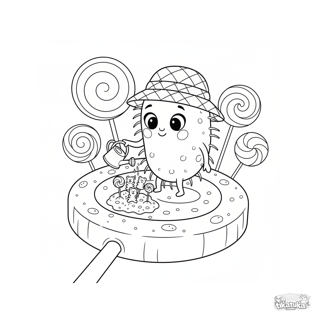 Ausmalbild für Kinder 4-6: eine freundliche Komma-Mikrobe gießt Candy-Sprösslinge auf einem Lutscher. Gemütlicher Storybook-Stil.