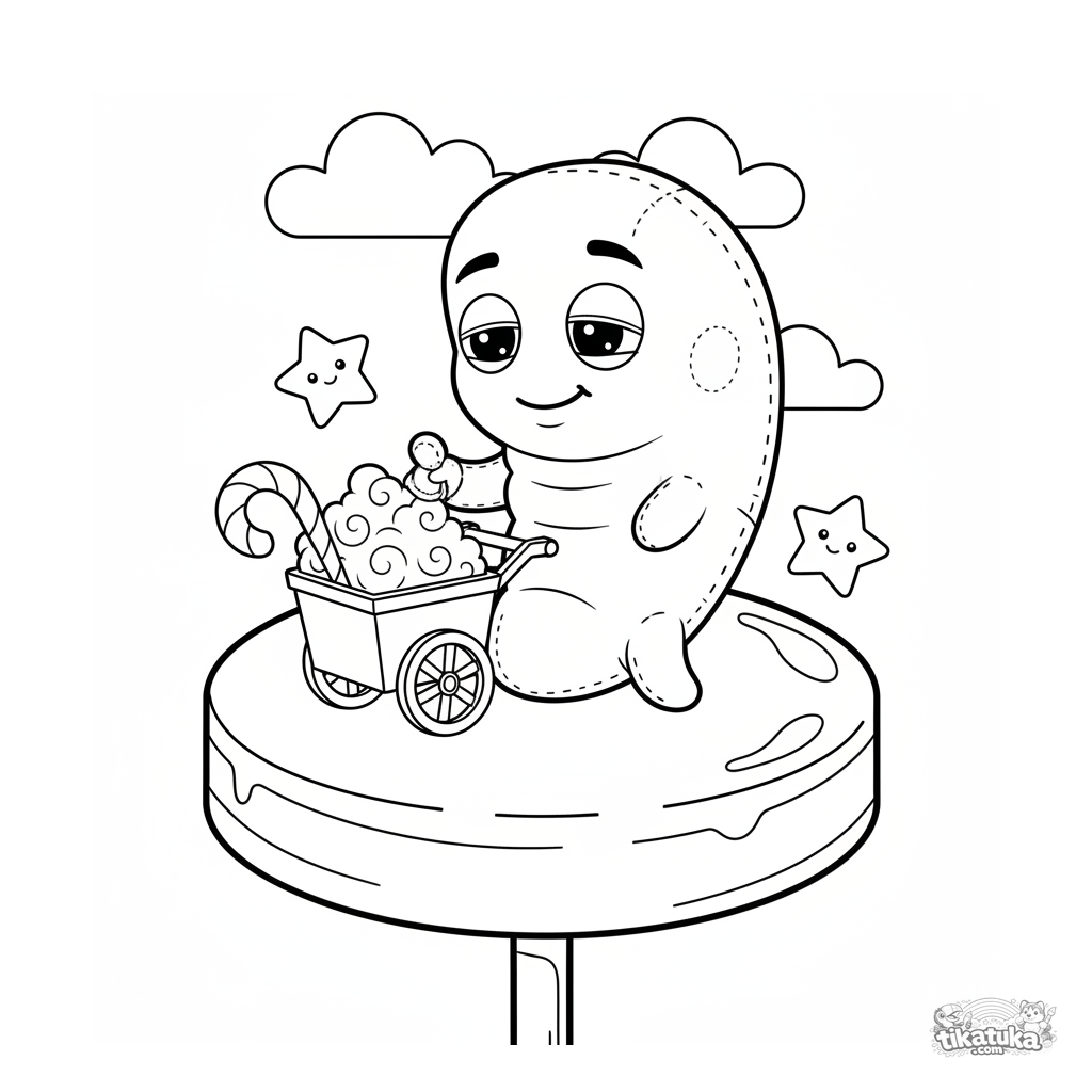 Ausmalbild für Kinder 4-6: Ein freundliches kommaförmiges Mikroben verkauft Zuckerwatte von einem Wagen auf einem Riesen-Lollipop. Weicher Puppen-Stil.