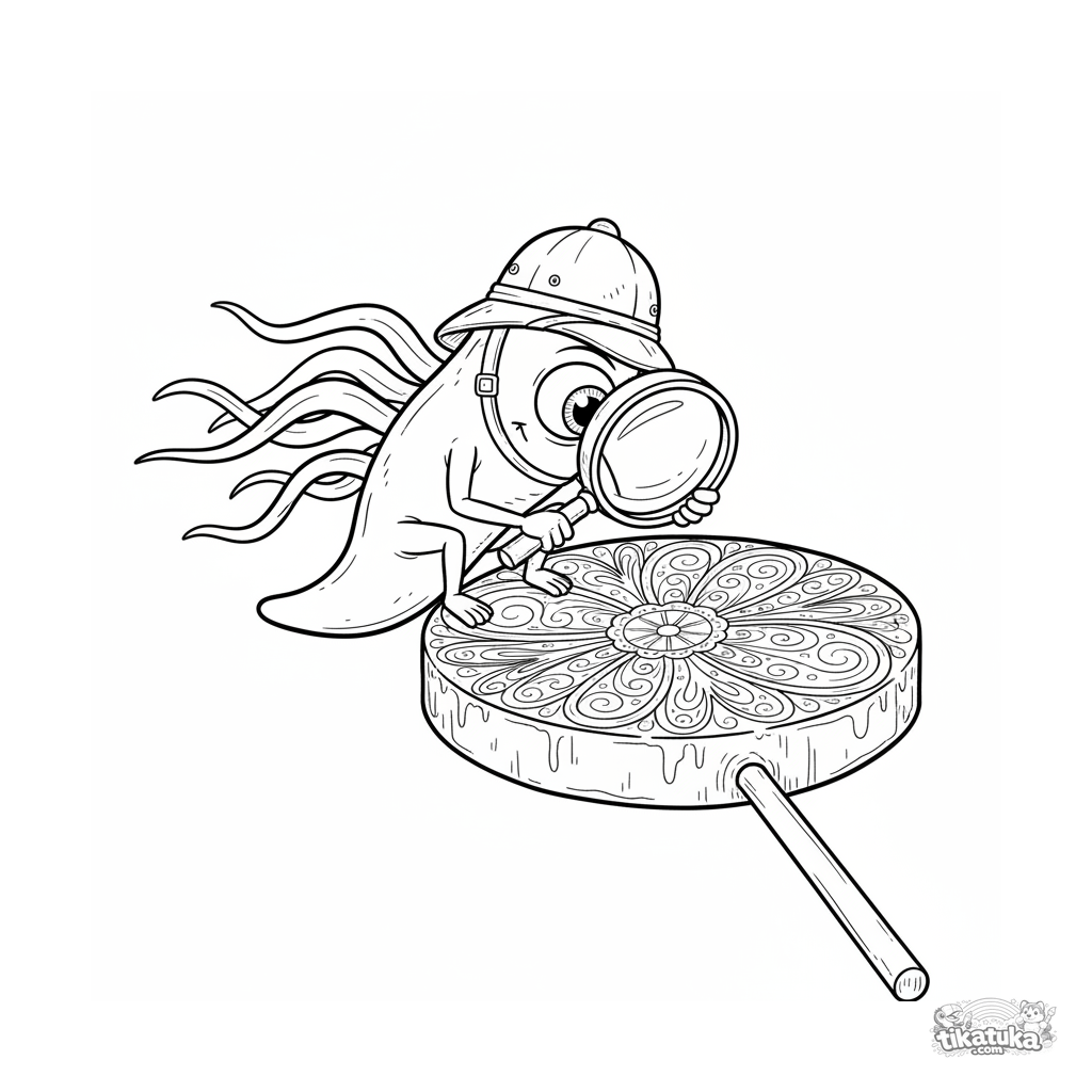 Detailliertes Ausmalbild für ältere Kinder 10-12: Eine kommaförmige Mikrobe erforscht die Muster eines Lollipops. Realistischer, wissenschaftlicher Stil.