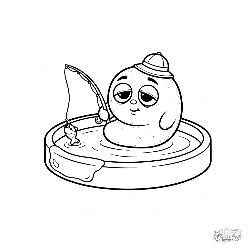 Ganz einfaches Ausmalbild für Kleinkinder 2-3: Ein kommaförmiger Mikrobe mit schläfrigen Augen angelt in einer Zucker-Pfütze auf einem Lollipop.