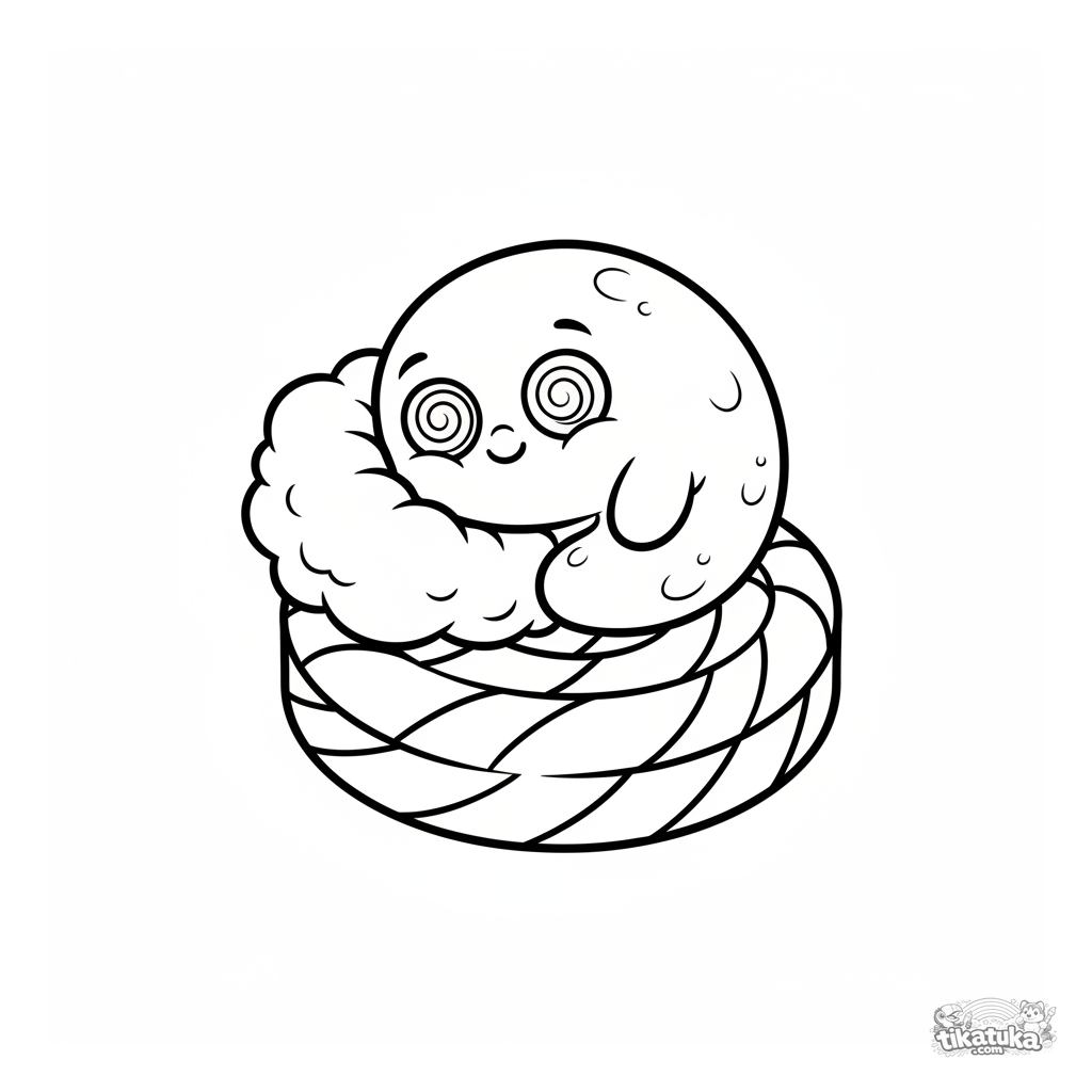 Sehr einfaches Ausmalbild für Kleinkinder 2-3: Ein weiches, kommaförmiges Mikrobe schläft auf einem Lollipop, Zuckerwatte als Kissen. Große, geschlossene Formen.
