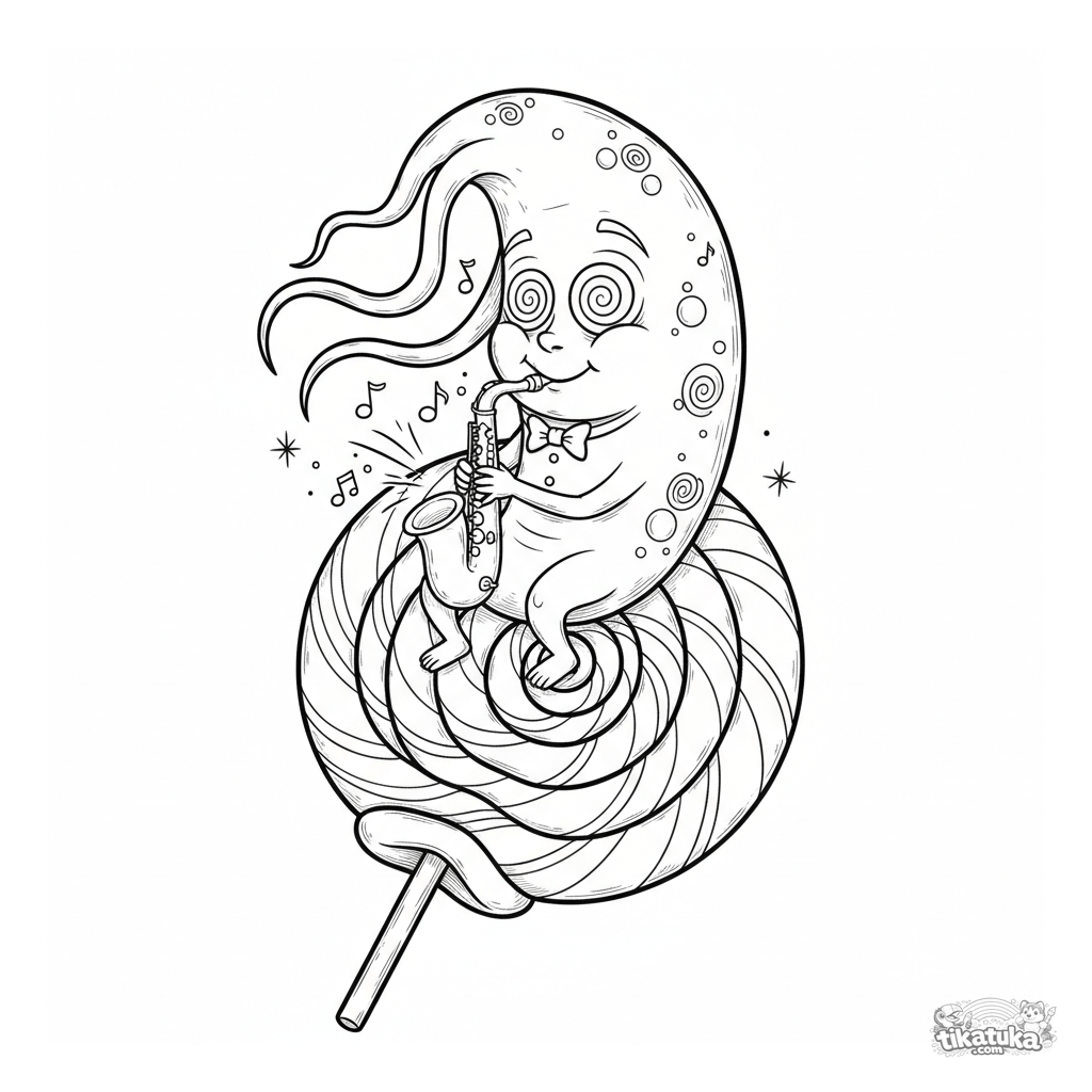 Detailliertes Ausmalbild für ältere Kinder 10-12: Eine kommaförmige Mikrobe spielt Saxophon auf einem wirbelnden Lutscher. Szene im Vintage-Stich-Stil.