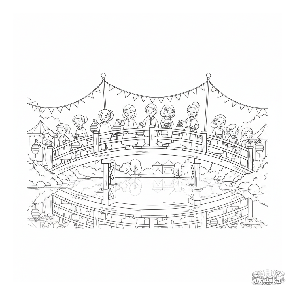 Kinder Ausmalbild: Dorfbewohner gehen in einem festlichen Laternenumzug über eine Holzbrücke in der Dämmerung, jeder trägt eine Papierlaterne.