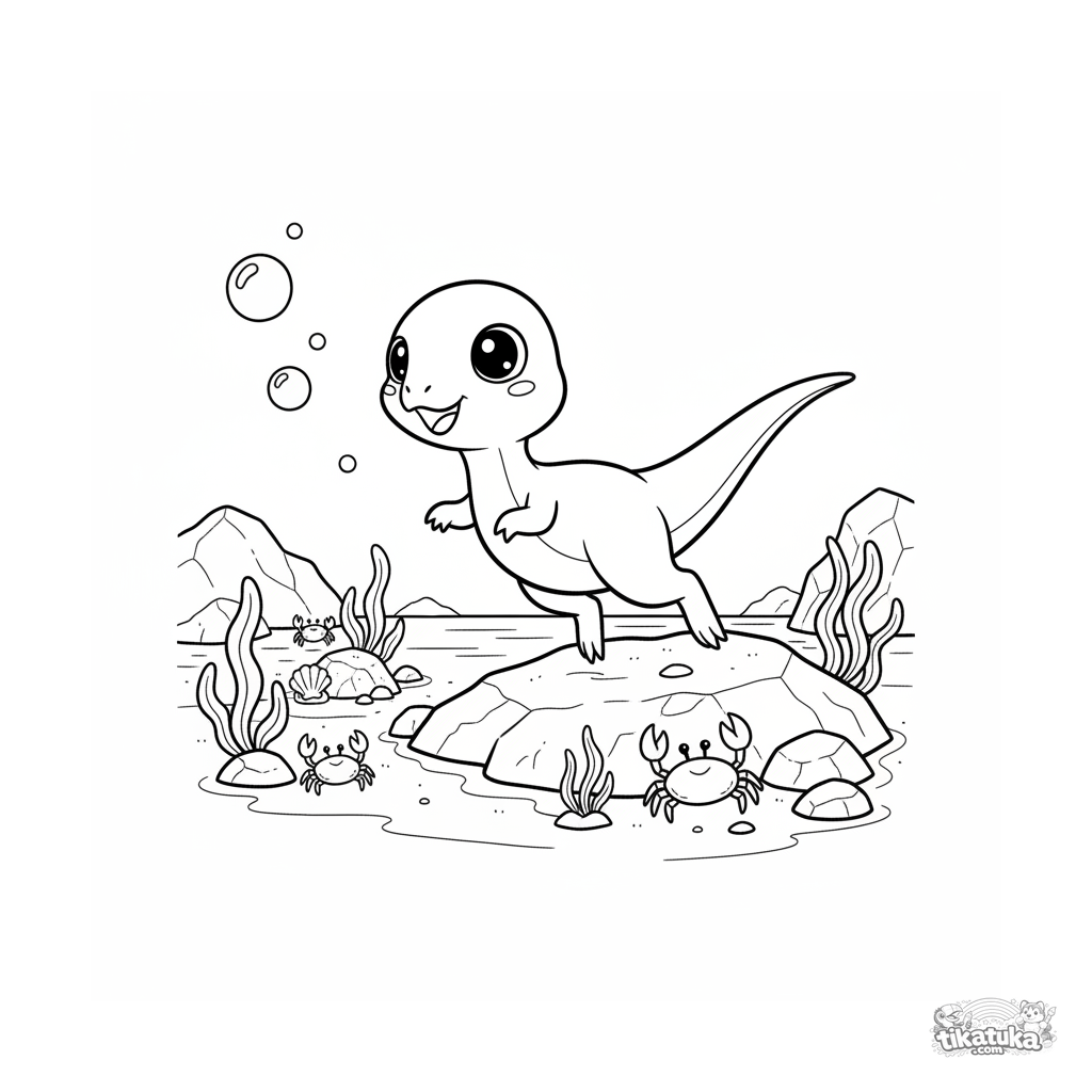 Lustiges Ausmalbild für 4-6 Jahre: Ein winziger Compsognathus-Dinosaurier jagt fröhlich Luftblasen zwischen Felsen im flachen Gezeitenwasser eines urzeitlichen Strandes.