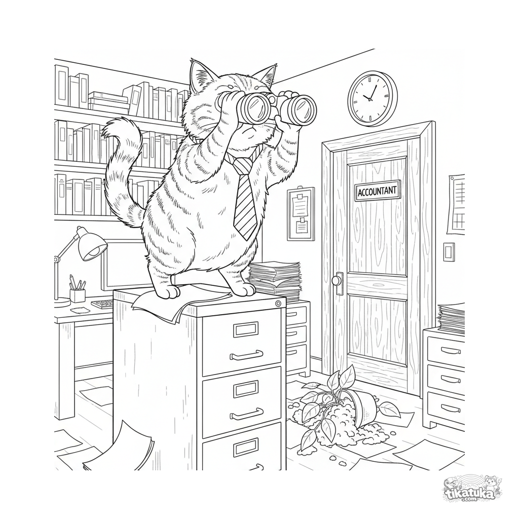 Ausmalbild für Kinder von 10-12 Jahren: Eine verwirrte Bürokatze klettert auf einen Aktenschrank und benutzt ein Fernglas, um die Tür des Buchhalters anzustarren. Detaillierte Meme-Szene im Graphic-Novel-Stil.