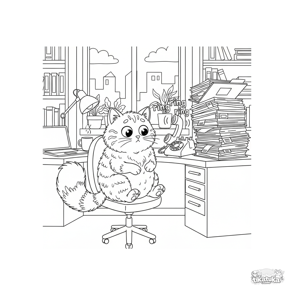 Ausmalbild für ältere Kinder: ein verwirrter Kater im Büro starrt ein klingelndes Telefon und einen wackeligen Ordnerstapel an. Detaillierte lustige Szene im Comic-Stil.